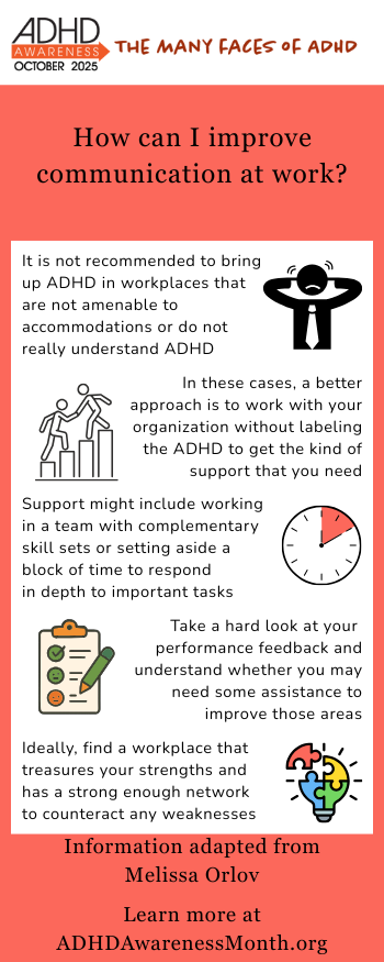 So workplace communication is an interesting, and maybe a little bit difficult topic. Not all workplaces are amenable to really accommodating ADHD. So you get the question of: Do I tell them about my ADHD? And, typically, I recommend not bringing it up. People who don’t understand ADHD tend to think you’re saying, “Well, gee, I have ADHD so I have an excuse for why I can’t do this” and ultimately what the workplace cares about is performance.