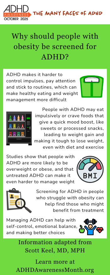 Studies show that people with ADHD are more likely to be overweight or obese, and that untreated ADHD can make it even harder to manage weight. Screening for ADHD in people who struggle with obesity can help find those who might benefit from treatment. Managing ADHD with medication, therapy, or both can help with self-control, emotional balance, and making better choices. This can make it easier to follow a healthy eating plan and reach weight goals.