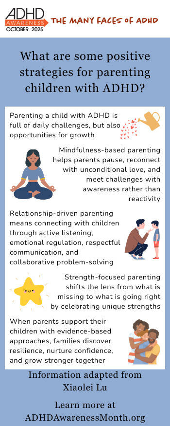 ADHD Awareness Month is a timely moment to reflect on how parents can support their children with evidence-based approaches such as Parent–Child Interaction Therapy and the Positive Parenting Program, as well as Collaborative & Proactive Solutions, Mindfulness-Based Parenting, Behavioural Parent Training, and the Nurtured Heart Approach, and become their children’s strongest allies.